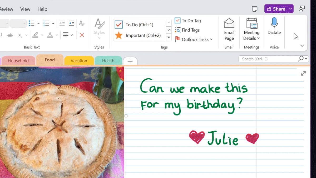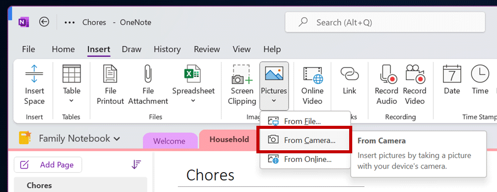 OneNote already makes text in pictures searchable. This has been useful for snapping a picture of a recipe or whiteboard. Now we’ve made it easier to insert from camera, which launches the Windows camera app and inserts pictures you capture directly into OneNote.